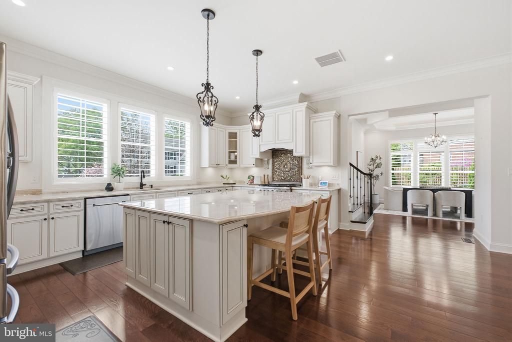 Tucked into a sought-after Vienna neighborhood, this custom-built home offers the rare feeling of quiet privacy—an everyday retreat with room for everyone when it is time to gather. From the moment you step into the marble-floored foyer with tray ceilings, the tone is set with thoughtful craftsmanship, generous scale, and an easy flow that makes both peaceful mornings and lively celebrations feel effortless across three finished levels. The main level impresses with 10-foot ceilings, rich hardwood floors, and plantation shutters, framing light-filled spaces that strike the perfect balance between intimate comfort and large-scale entertaining. The chef’s kitchen is the heart of the home, featuring an oversized island with ample seating and storage, granite countertops, and premium stainless-steel appliances, including a Kucht 6-burner gas range and double wall ovens. Conversations naturally gather around the kitchen, where meals come to life. A sunny breakfast room opens onto the rear patio, creating a seamless connection between indoor and outdoor dining. The family room, with its coffered ceiling, gas fireplace, and French doors, offers a cozy yet sophisticated space. For more formal occasions, the living and dining rooms, both with tray ceilings, set the stage for elegant holiday hosting, while the butler’s pantry with wine fridge ensures smooth entertaining. The main level also includes a bedroom and a thoughtfully designed mudroom for everyday convenience. Upstairs, the sense of calm continues with 10-foot ceilings and hardwood floors throughout. The primary suite is a true sanctuary, offering a spacious sitting area, tray ceiling, and gas fireplace—a perfect retreat for unwinding at the end of the day. Step through French doors to your own private balcony for fresh air and quiet moments. A coffee bar with a wine fridge and sink enhances the suite’s charm, ideal for leisurely mornings or a nightcap before bed. Additional bedrooms are designed for modern living, including an au pair/nanny suite or office with an ensuite bath and private staircase, as well as three more generously sized bedrooms (one with an ensuite bath and two connected by a Buddy Bath). A separate laundry room ensures the household runs smoothly. The lower level is designed with both functionality and fun in mind, offering a space perfect for movie nights, game days, or hosting gatherings that don’t interrupt the flow of the main living areas. With 9-foot ceilings and ceramic tile flooring, the expansive rec room provides ample space for media, dining, and play. A stylish kitchenette with island seating, under-cabinet lighting, a sink, and a wine fridge makes entertaining easy. A bedroom and full bath create a comfortable space for overnight guests, while the wine room—capable of storing over 300 bottles—adds a touch of sophistication. A bonus workout room rounds out this level, ensuring there’s something for everyone. The spacious patio extends the living space outdoors, ideal for summer meals, milestone celebrations, or simply enjoying the serenity of your surroundings. Conveniently located near shopping, dining, parks, and commuter routes, and just approximately 1 mile from the Vienna Metro Station, this exceptional home offers a perfect blend of peaceful, private living and everyday convenience.